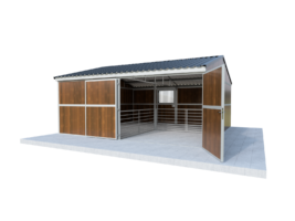 We supply indoor stables, complete outdoor stables, field shelters, group housing systems, small livestock sheds (such as sheep sheds) and full stable complexes in various designs and sizes. All our stables are modular, making them easy to expand or adapt. We also supply individual stable components such as front walls, partitions, back walls, feed fronts, feed fences, stable windows, doors and stable accessories.