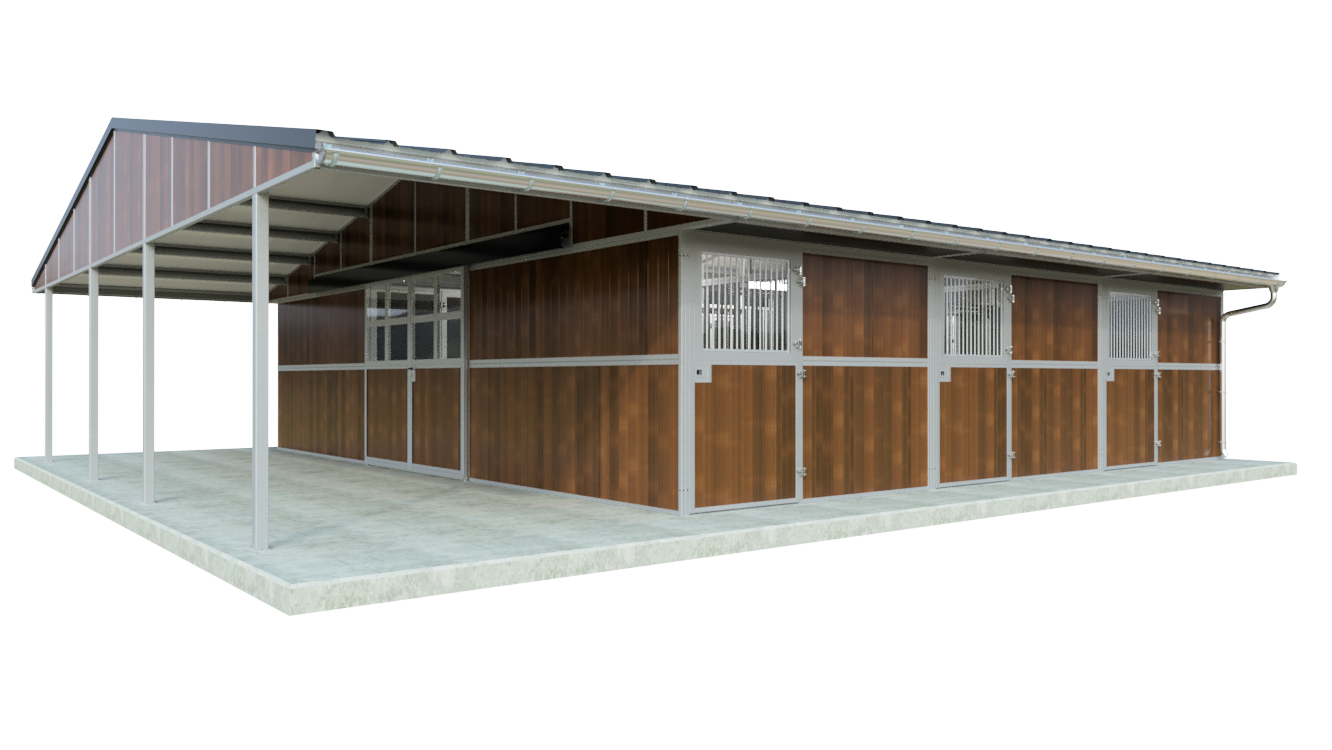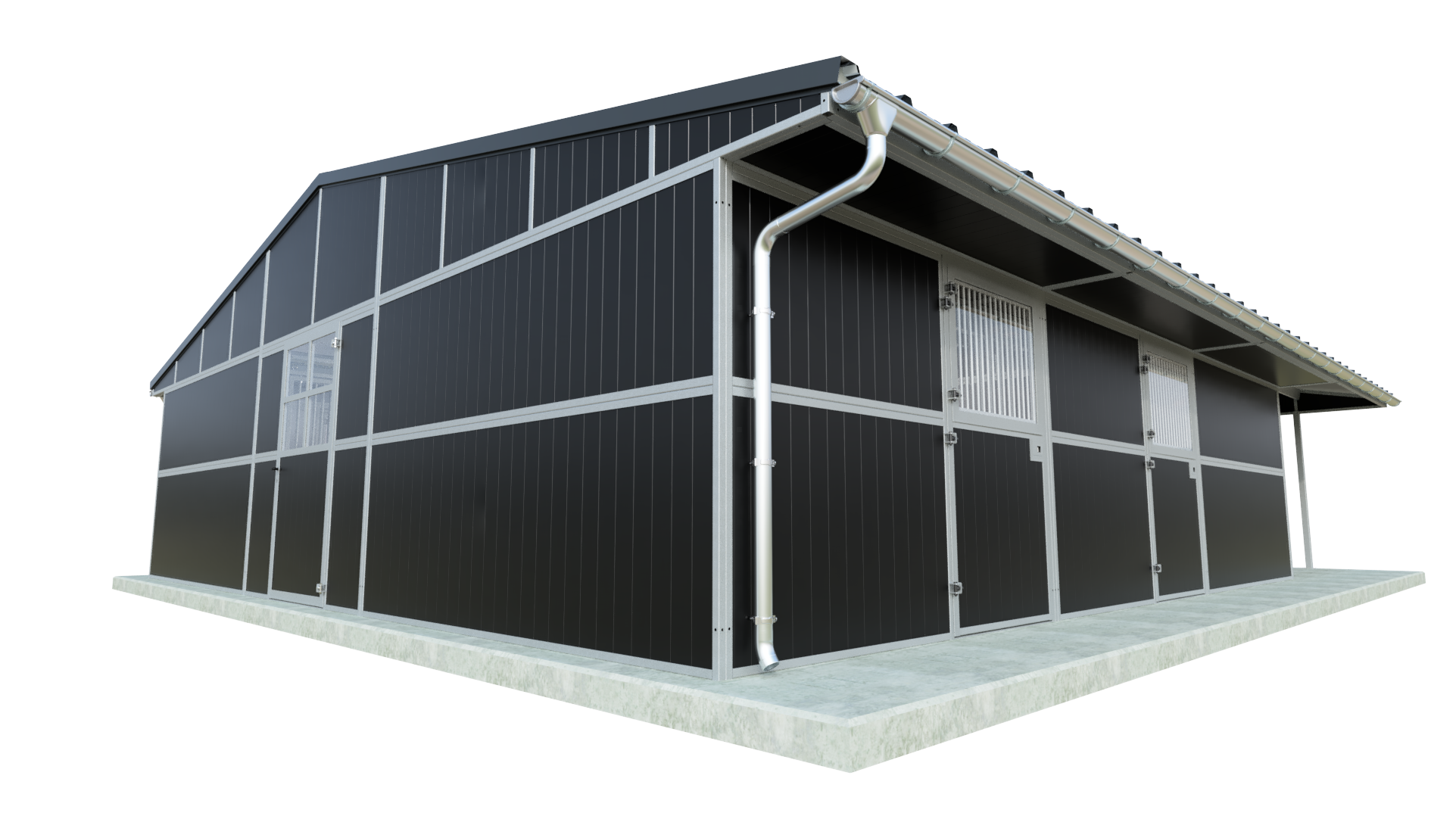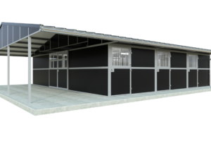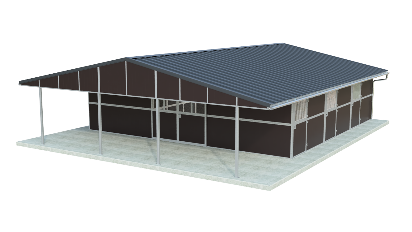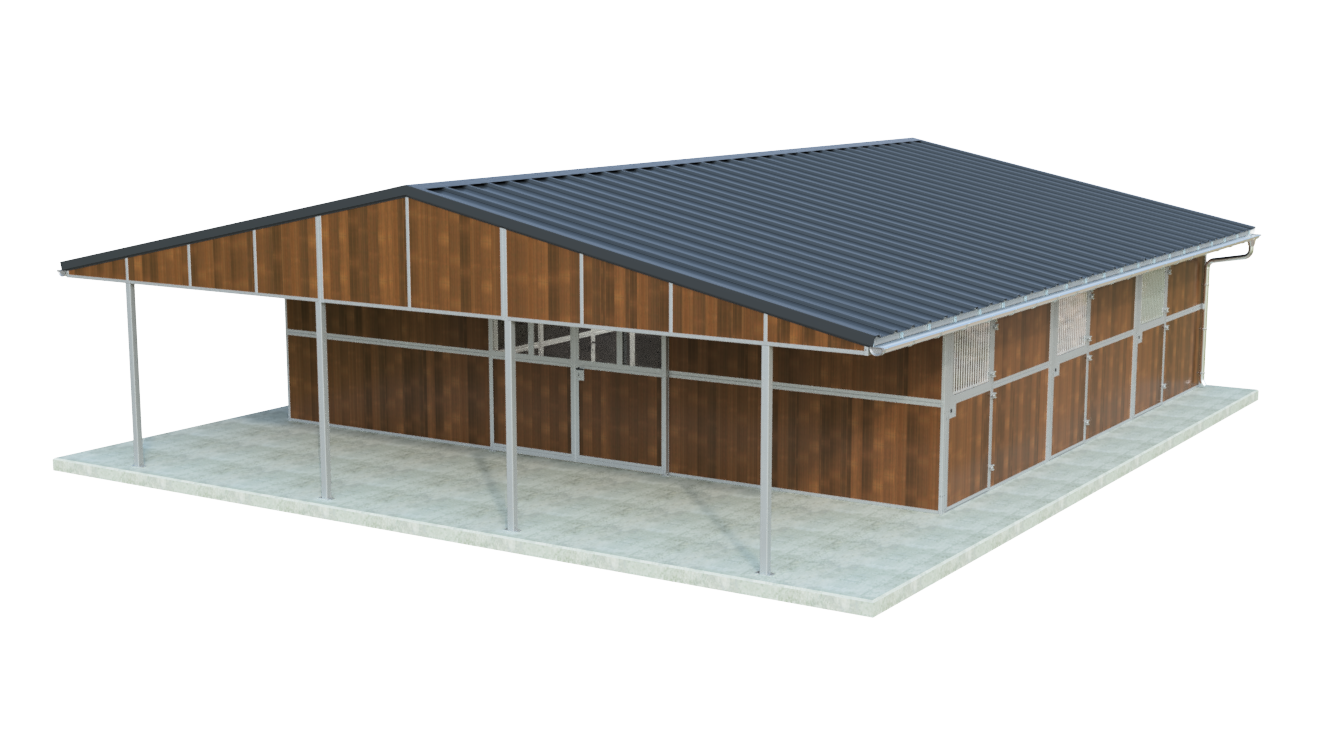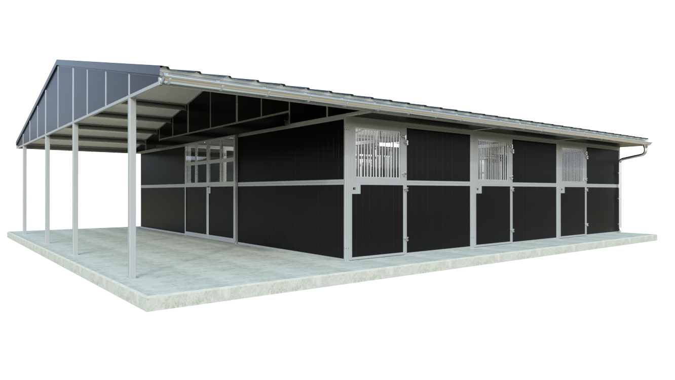 This outdoor horse stable with five horse boxes, storage and canopy from Mulder Stable and Yard offers a durable and flexible solution with sliding doors, tilt-and-turn stable doors, an insulated roof and a spacious covered area, suitable for intensive use across Europe.