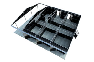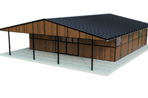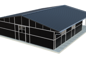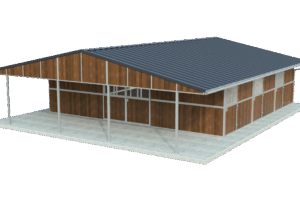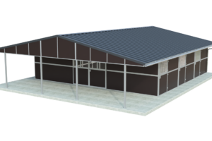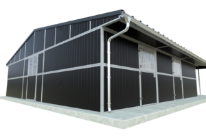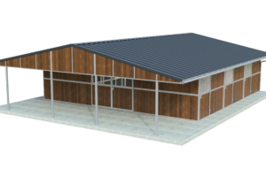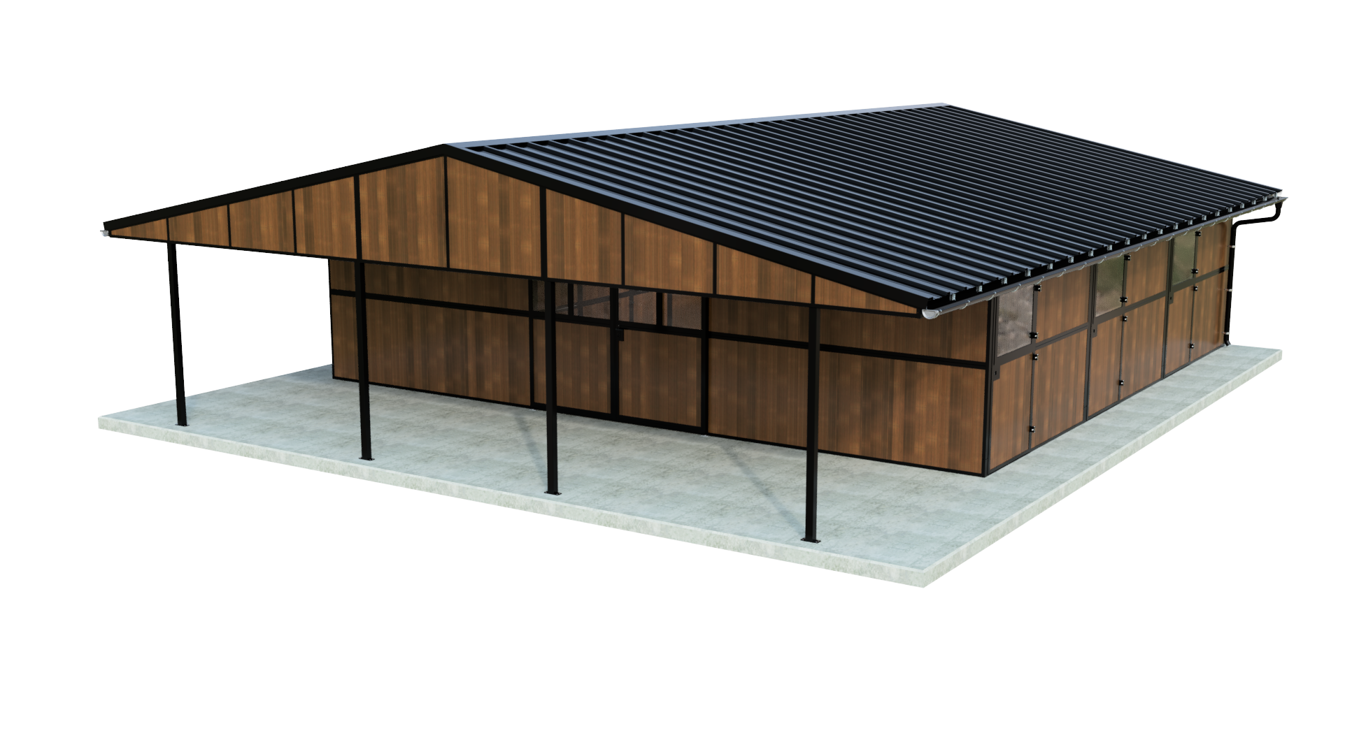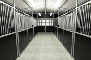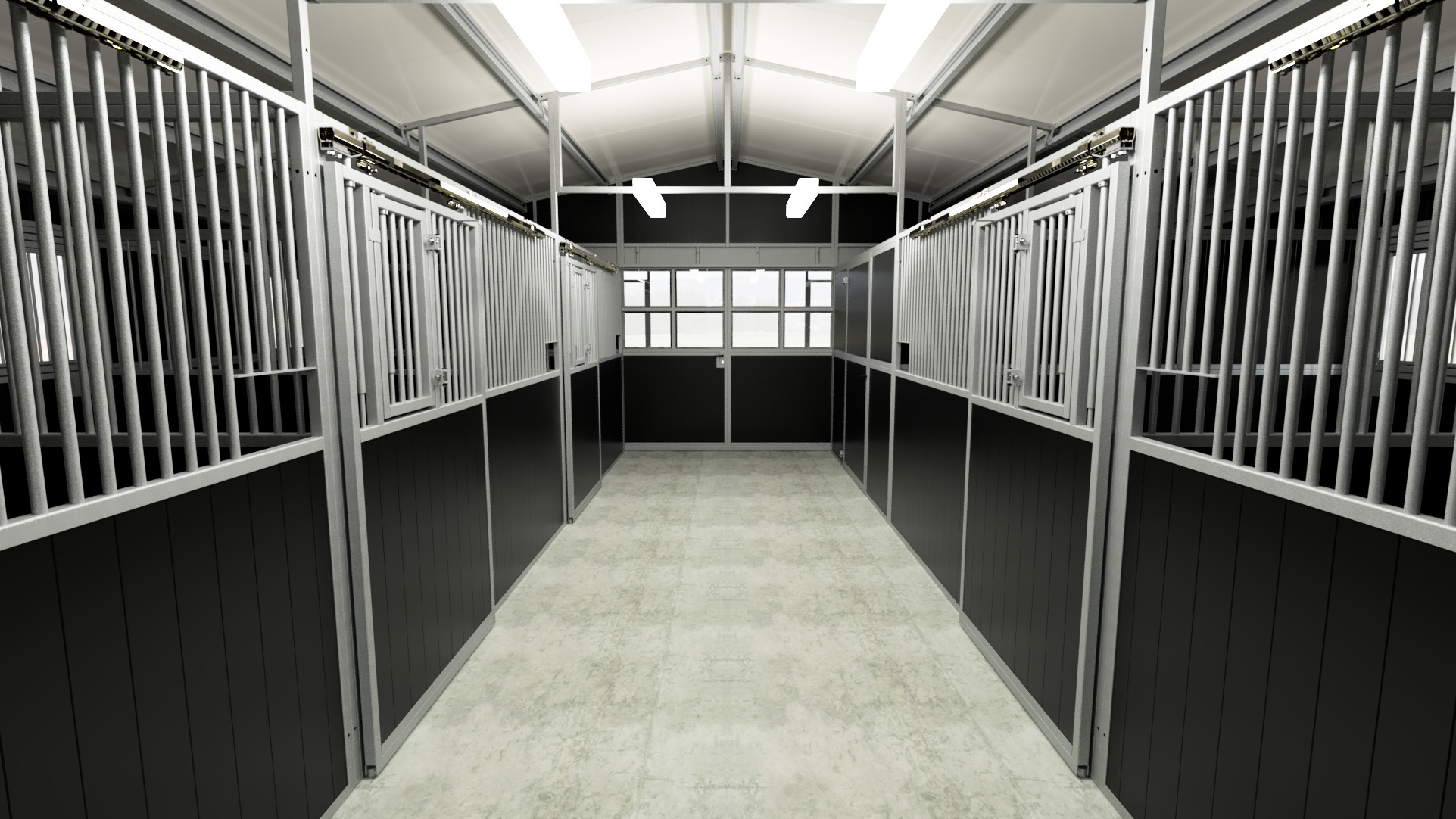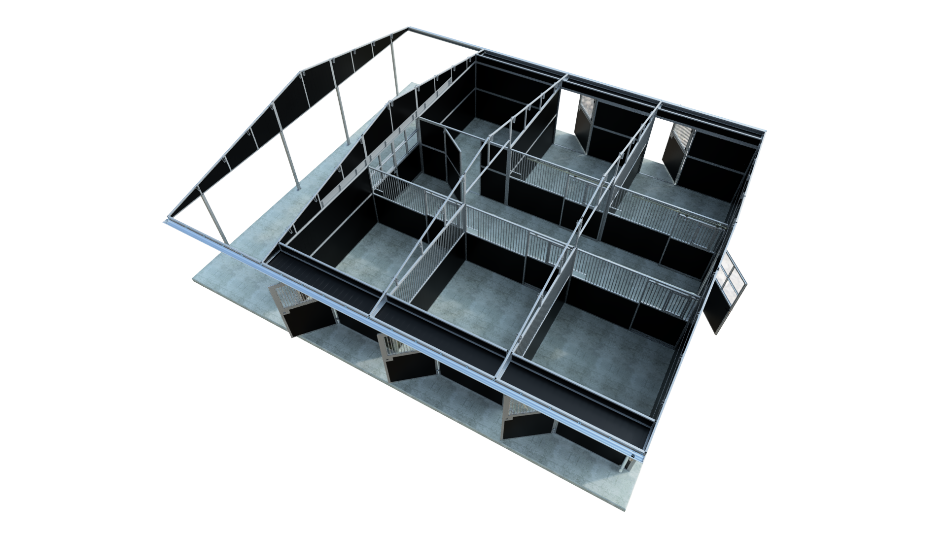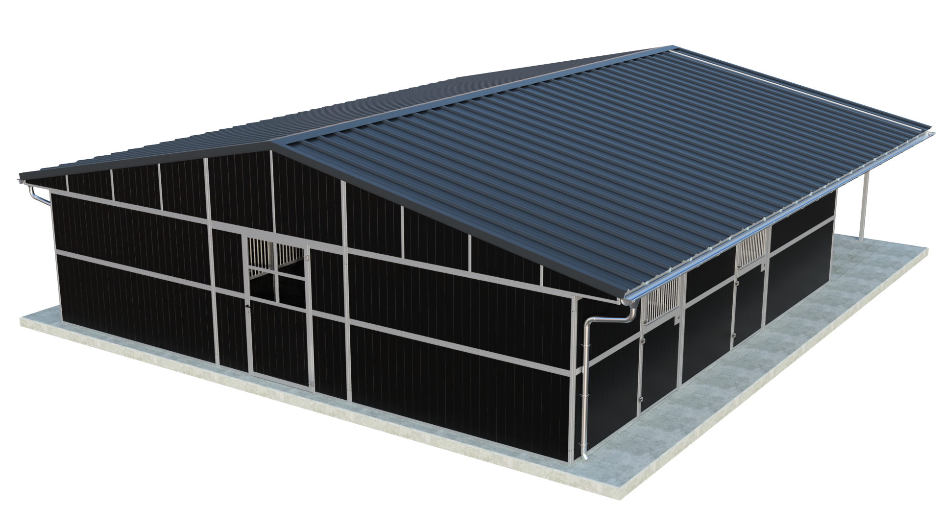 This outdoor horse stable with five horse boxes, storage and canopy from Mulder Stable and Yard offers a durable and flexible solution with sliding doors, tilt-and-turn stable doors, an insulated roof and a spacious covered area, suitable for intensive use across Europe.