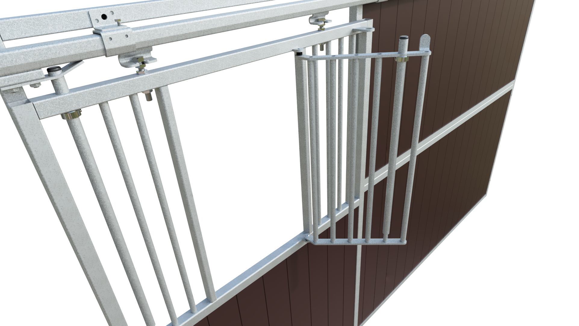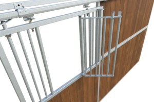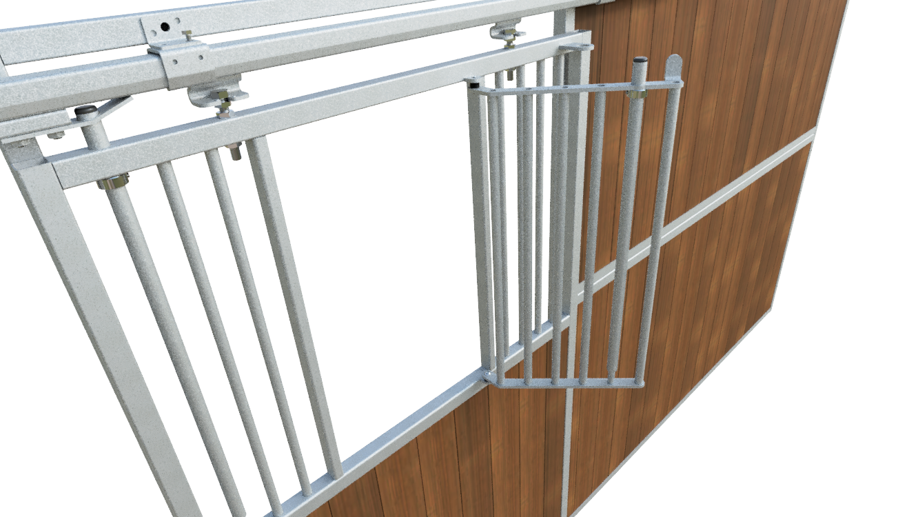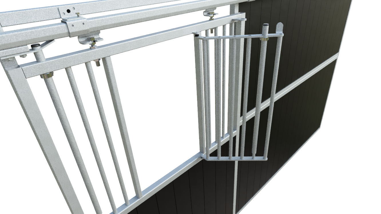 The stable front features a strong 40 x 40 mm box section combined with a solid 3 mm thick U-profile, providing excellent stability. Vertical bars with a diameter of 22 mm and a bar spacing of 50 mm ensure a high level of safety for daily stable use.