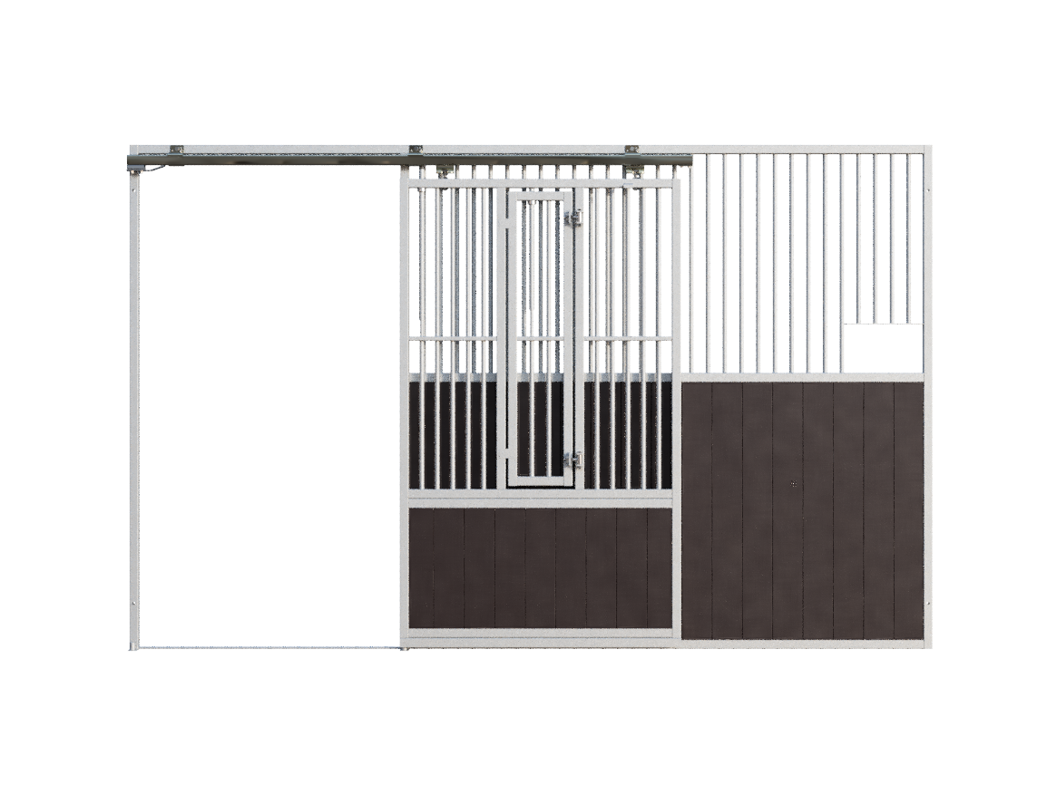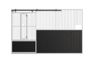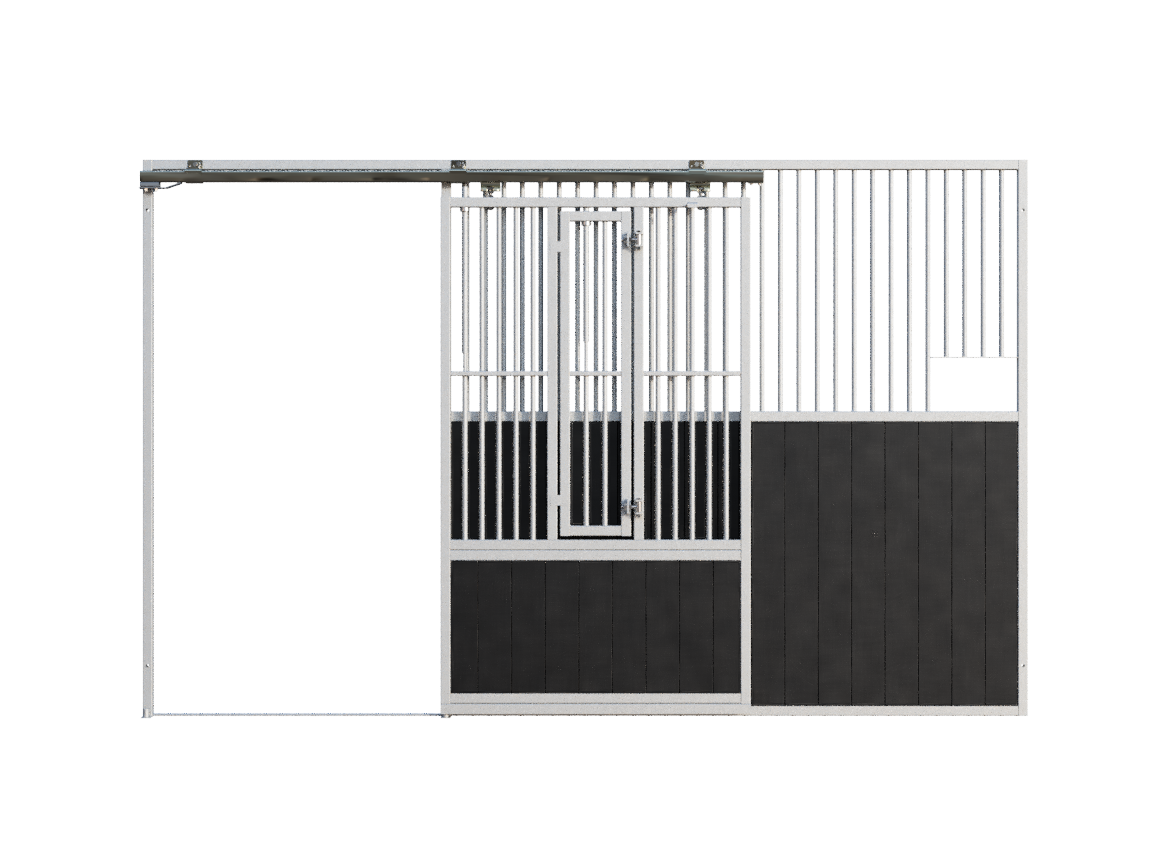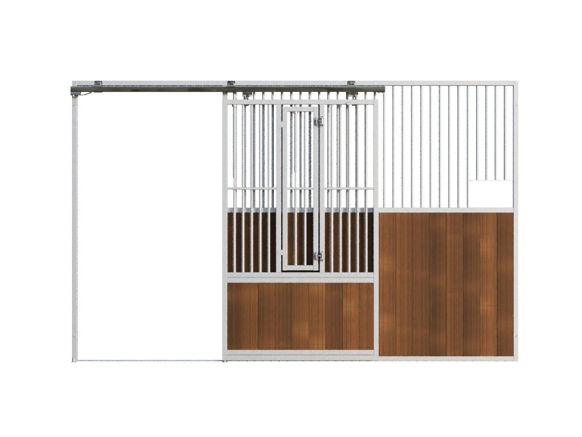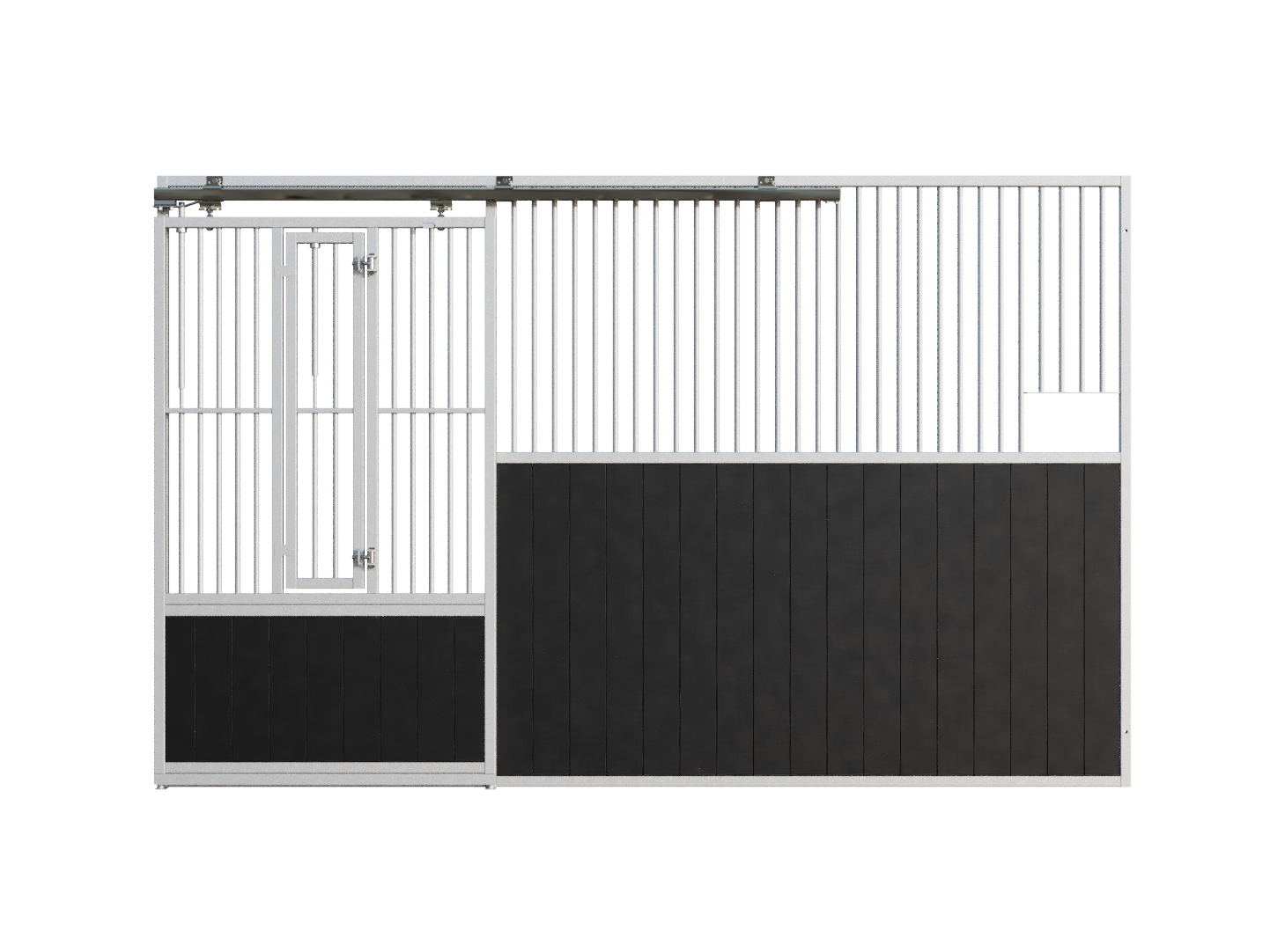 The Stable Box Front Basic with Sliding Door and Feed Opening from Mulder Stable and Yard enables safe, efficient feeding from the aisle. The lockable feed opening and smooth-running sliding door save space, while the hot-dip galvanised steel construction with polymer or bamboo planks ensures a durable, low-maintenance solution for indoor and sheltered outdoor stables across Europe.
