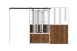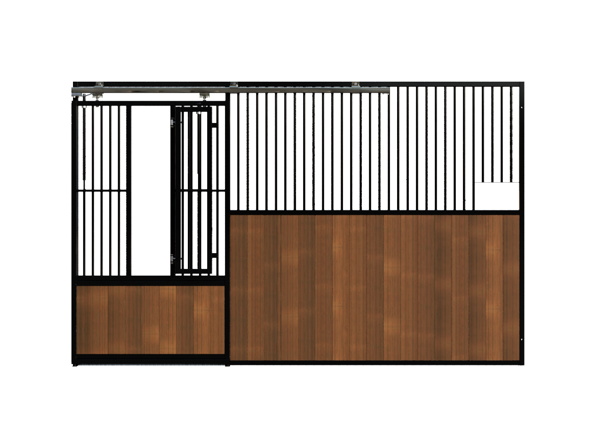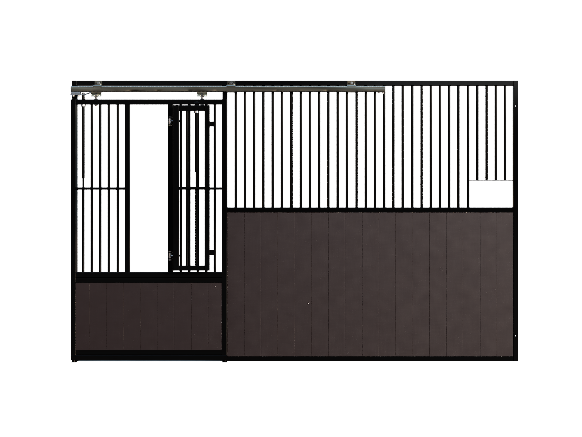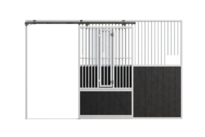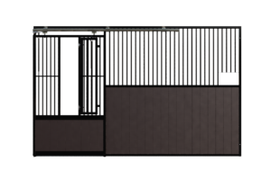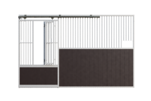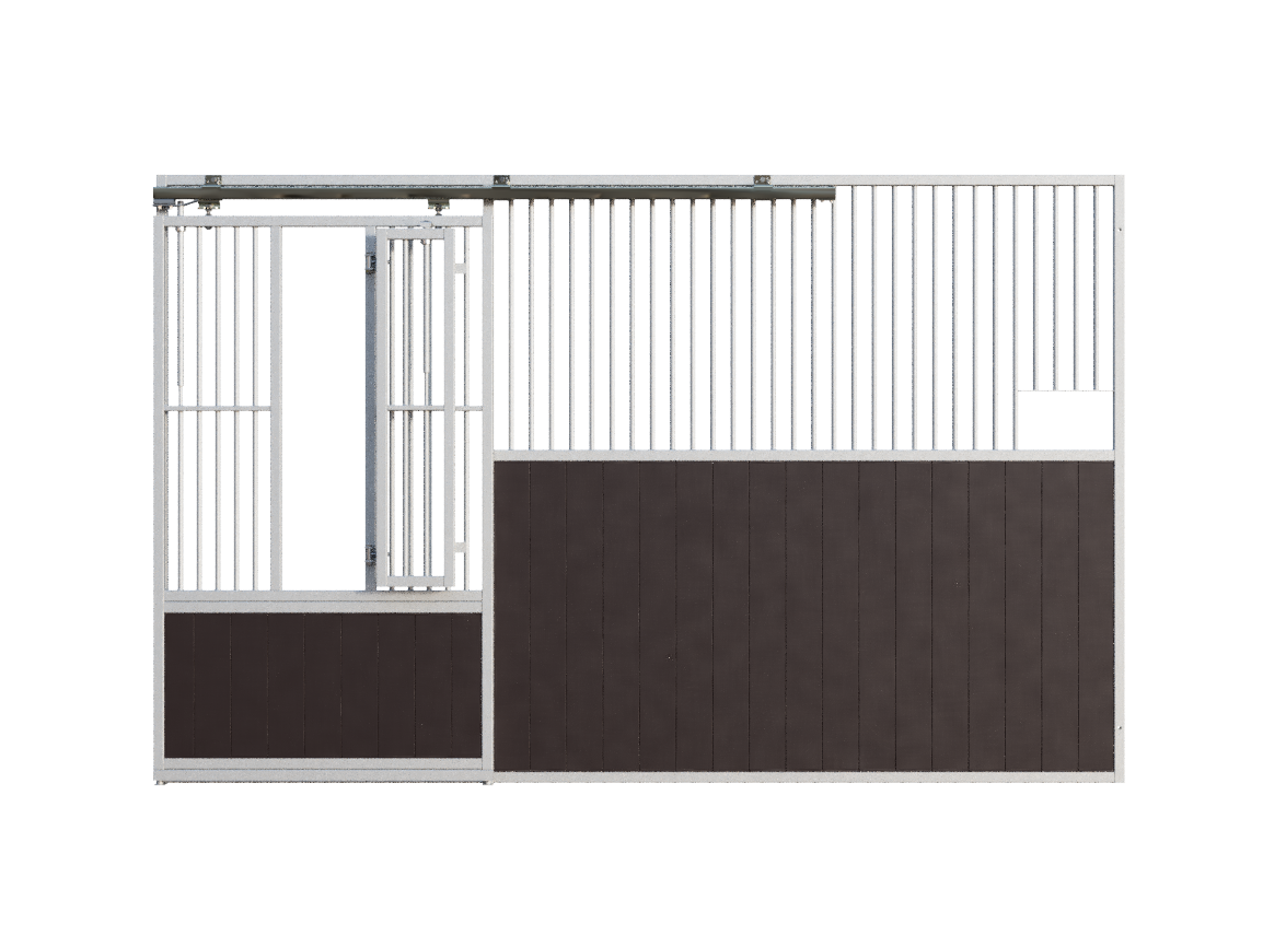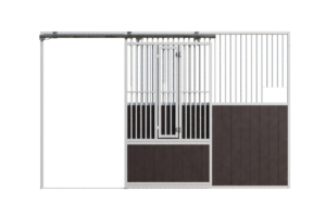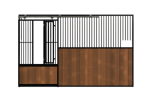The Stable Box Front Basic with Sliding Door and Feed Opening from Mulder Stable and Yard enables safe, efficient feeding from the aisle. The lockable feed opening and smooth-running sliding door save space, while the hot-dip galvanised steel construction with polymer or bamboo planks ensures a durable, low-maintenance solution for indoor and sheltered outdoor stables across Europe.