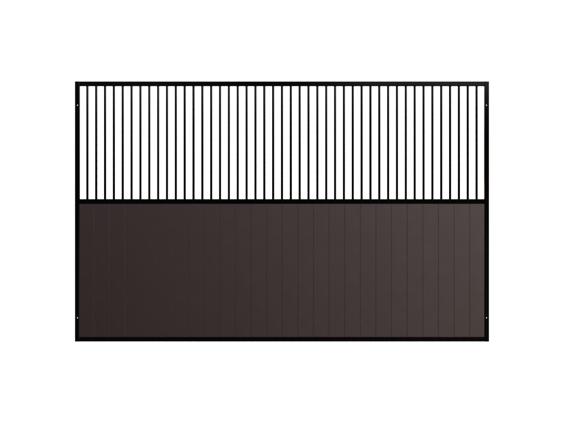 The stable box partition Basic with upper bars provides a safe and practical separation between horse boxes while allowing visual contact between horses, and is available from stock.