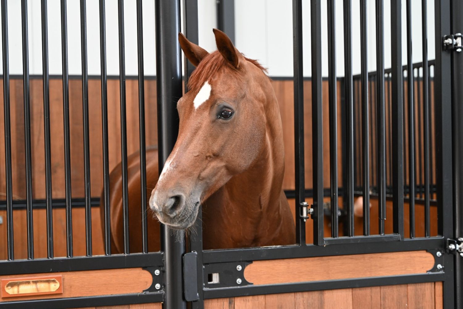 Inside the stable, the partition walls are fitted with upper bar sections. Here as well, bamboo combined with black powder-coated steel was chosen, ensuring a consistent visual language throughout the stable while providing optimal ventilation and controlled interaction between the horses.