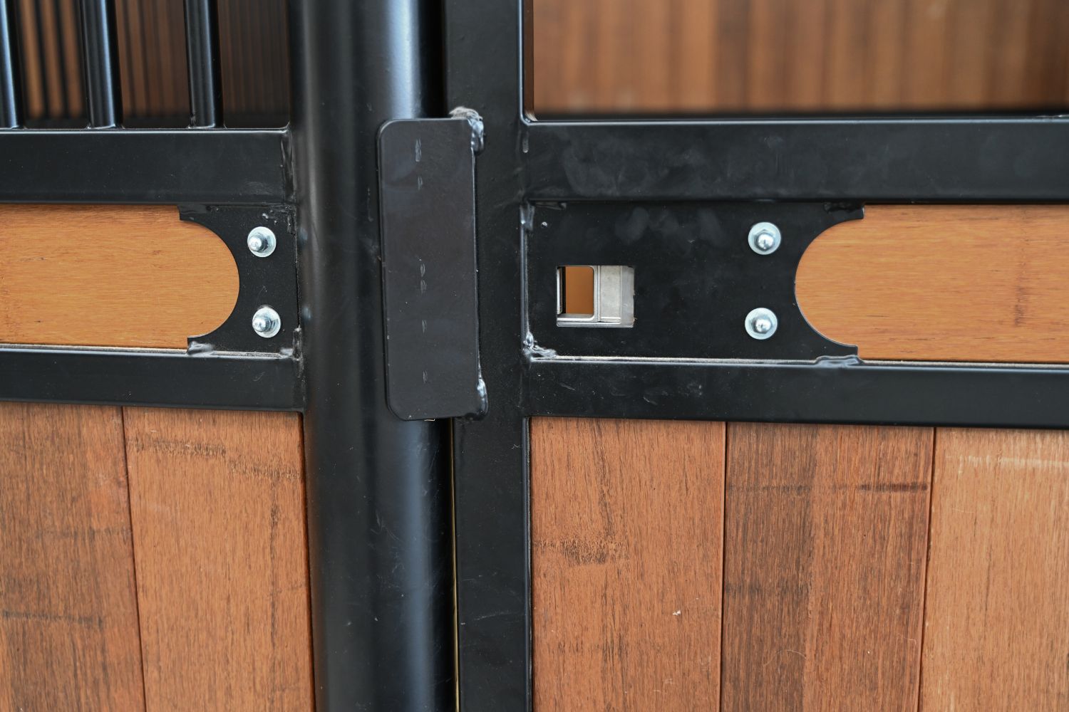 The horse boxes are equipped with our most luxurious box fronts: the Stable Box Front Premium Luxe High with Swing Door and Mini Door, featuring a high front with an integrated mini door in the hinged door. These elegant fronts are defined by subtle curves, high-quality bars and a secure, robust locking system. The bamboo planks add warmth and character, while the black powder-coated steel brings strength and visual calm, perfectly suited to a refined indoor stable environment.